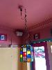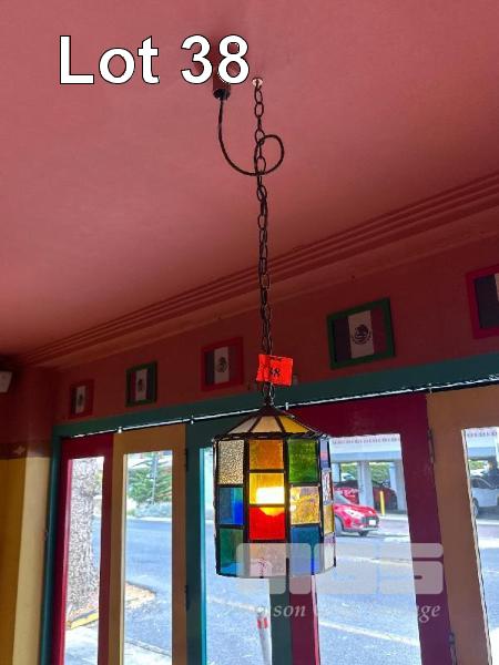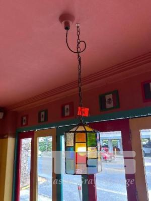 PAIR VINTAGE PENDANT LEADLIGHTS, GLASS SHADE, 200 x 300mm, 500mm CHAIN, 240V, 10 AMP PLUG