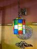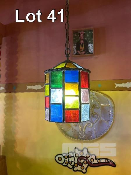 PAIR VINTAGE PENDANT LEADLIGHTS, GLASS SHADE, 200 x 300mm, 1200mm CHAIN, 240V, 10 AMP PLUG