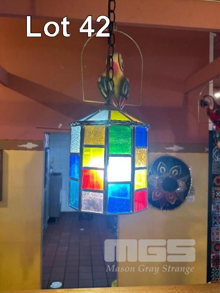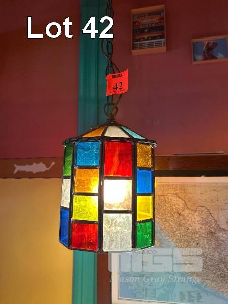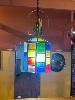 PAIR VINTAGE PENDANT LEADLIGHTS, GLASS SHADE, 200 x 300mm, 1200mm CHAIN, 240V, 10 AMP PLUG
