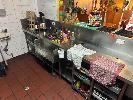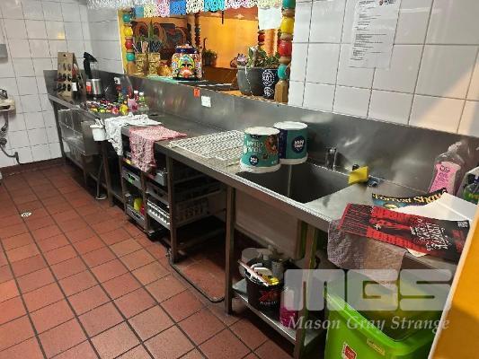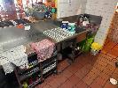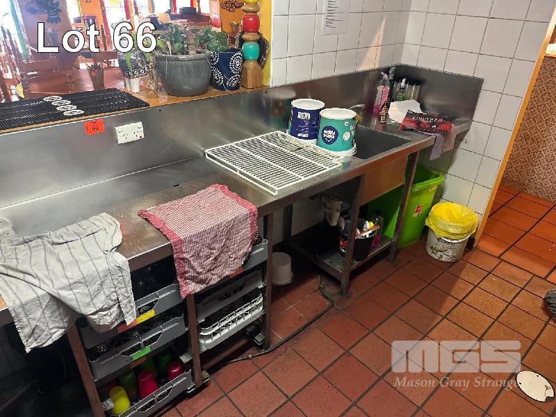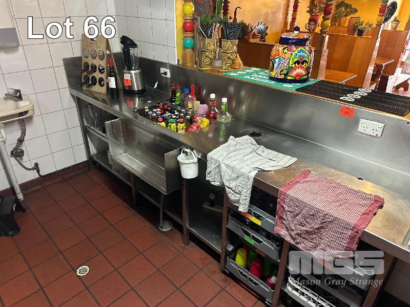LARGE STAINLESS STEEL BENCH, 4500 x 600mm WITH DEEP BOWL SINK, ICE TROUGH, GLASS TRAY STORAGE, BOTTLE STORAGE & UNDERBENCH SHELVES