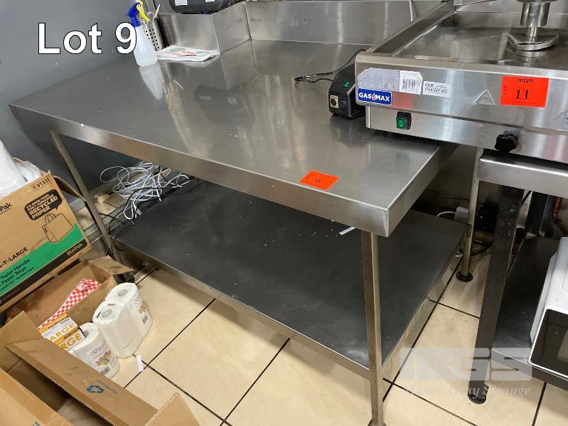 STAINLESS STEEL BENCH WITH SPLASH BACK, 1570 x 900mm WITH CUTOUT (LH CORNER)