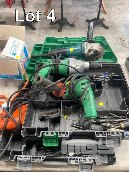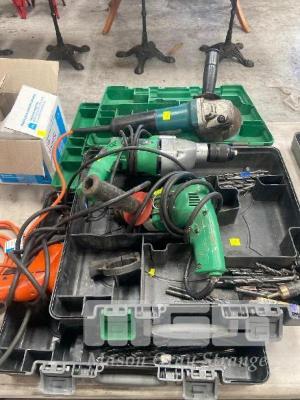 HITACHI DRILL & MAKITA GRINDER, 240V, WITH 2 x CASES, DRILL BITS & GRINDING DISC