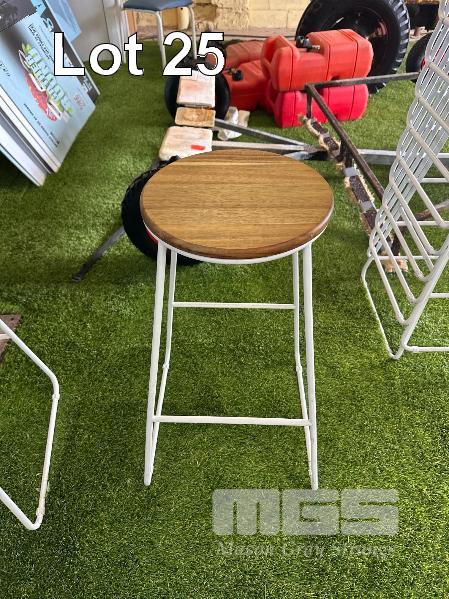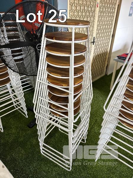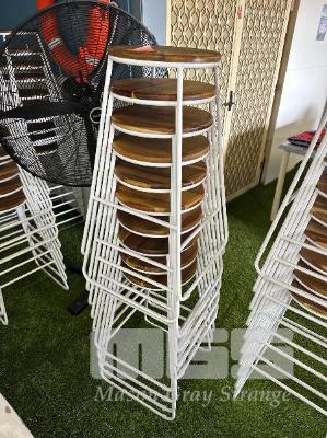 10 x TIMBER TOP BAR STOOLS, WHITE STEEL FRAME, STACKABLE, 700mm