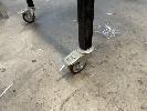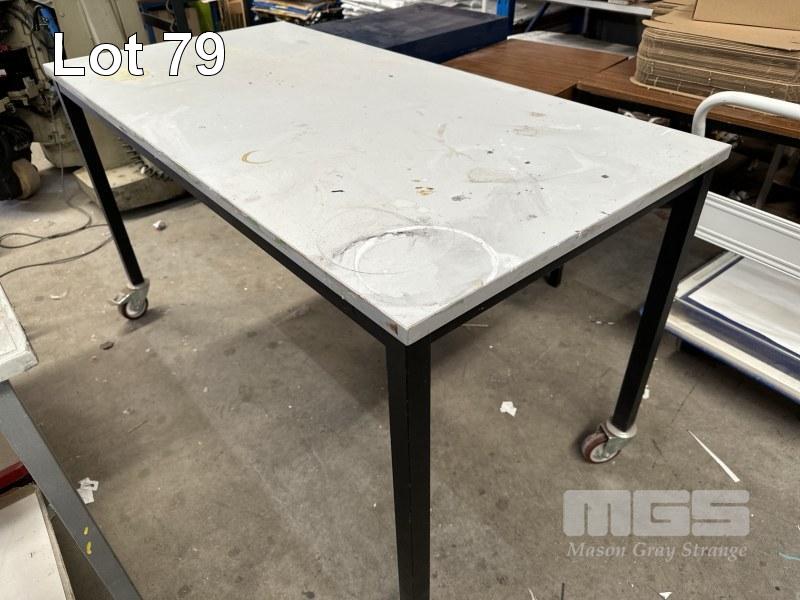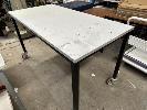 2 x MOBILE TABLES, WHITE LAMINATE TOP, EACH 150 x 75cm