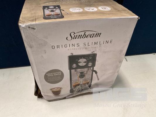 COFFEE MACHINE, SUNBEAM ORIGINS SLIMLINE - BLACK, EMM4500BK (RRP $299) (BOXED) (SUBJECT TO INSURANCE CLAIM)