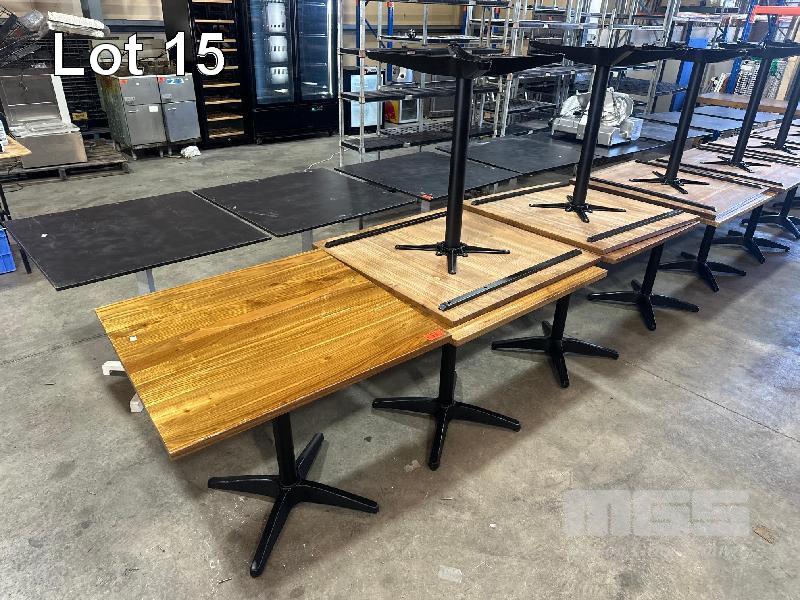 7 x CAFE TABLES, TIMBER TOP, STEEL PEDESTAL BASE