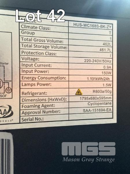 WINE FRIDGE, HUSKY MOD: HUS-WC168S-BK-ZY CAPACITY: 462L 240V 10AMP PLUG NOTE: OUTER GLASS BROKEN , NOT COOLING