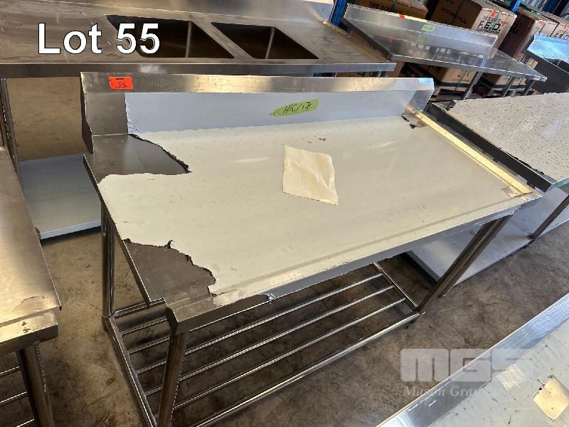 STAINLESS STEEL BENCH, 2 TIER WITH SPLASHBACK LHS DISHWASHER LIP, 1525 x 700mm (FACTORY SECONDS UNUSED)