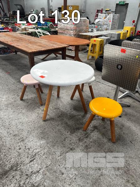 STEEL TOP CIRCULAR CAFE TABLE, WHITE TIMBER LEGS 3 x MATCHING STOOLS WHITE, YELLOW & PINK