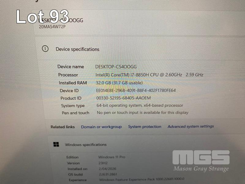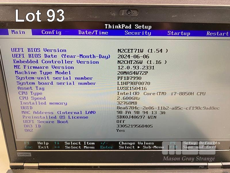 LAPTOP, LENOVO THINKPAD P52 MOBILE WORKSTATION, TYPE 20MA, CORE i7 8850H (8TH GEN) @ 2.6GHz, 32GB DDR4 RAM, 512GB NVMe M.2 SSD, 15.6" WIDESCREEN (1920x1080), 4GB NVIDIA QUADRO P2000 VIDEO, Wi-Fi, BLUETOOTH, WINDOWS 11 PRO INSTALLED & POWER SUPPLY (NOTE: MARKS ON SCREEN) S/N:PF1D7990