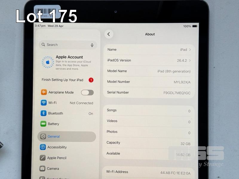 APPLE iPAD 8TH GEN, 32GB, Wi-Fi, SPACE GREY, MODEL MYL92X/A, A2270 WITH CABLE & CHARGER