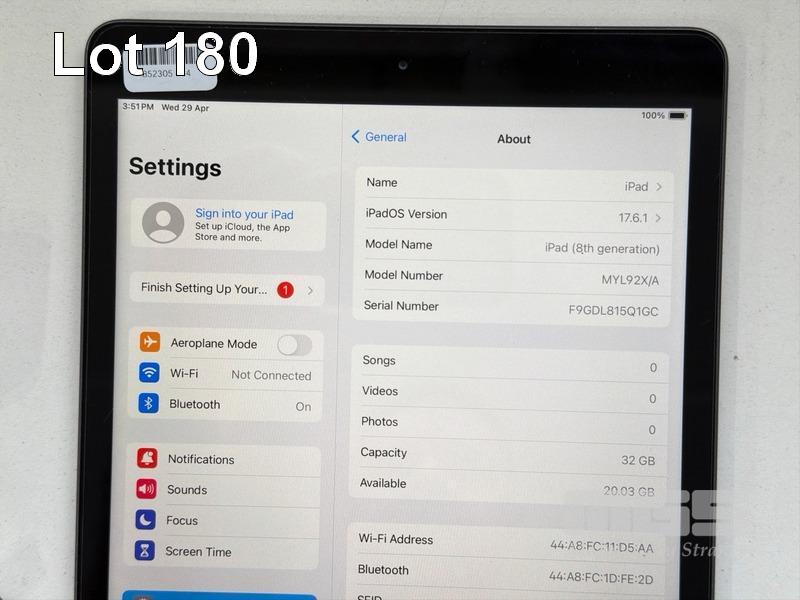 APPLE iPAD 8TH GEN, 32GB, Wi-Fi, SPACE GREY, MODEL MYL92X/A, A2270 WITH CABLE & CHARGER