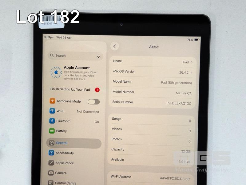 APPLE iPAD 8TH GEN, 32GB, Wi-Fi, SPACE GREY, MODEL MYL92X/A, A2270 WITH CABLE & CHARGER