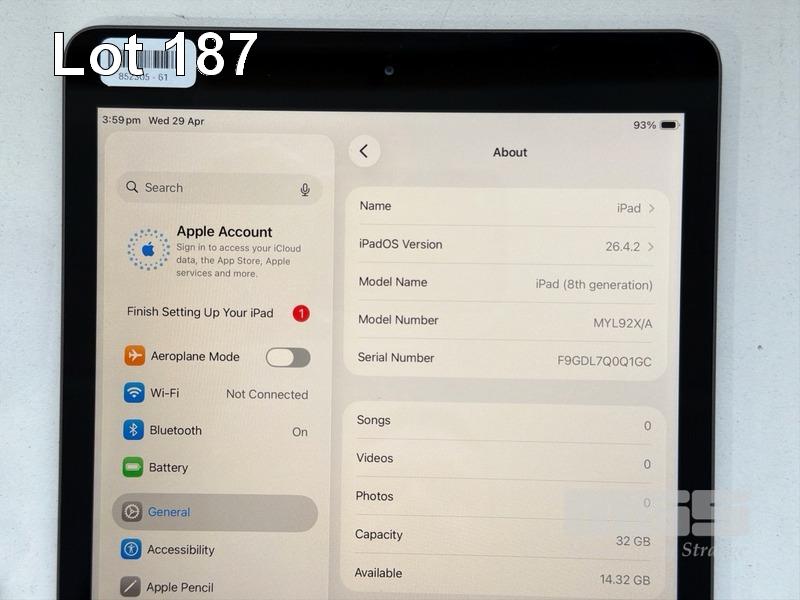 APPLE iPAD 8TH GEN, 32GB, Wi-Fi, SPACE GREY, MODEL MYL92X/A, A2270 WITH CABLE & CHARGER