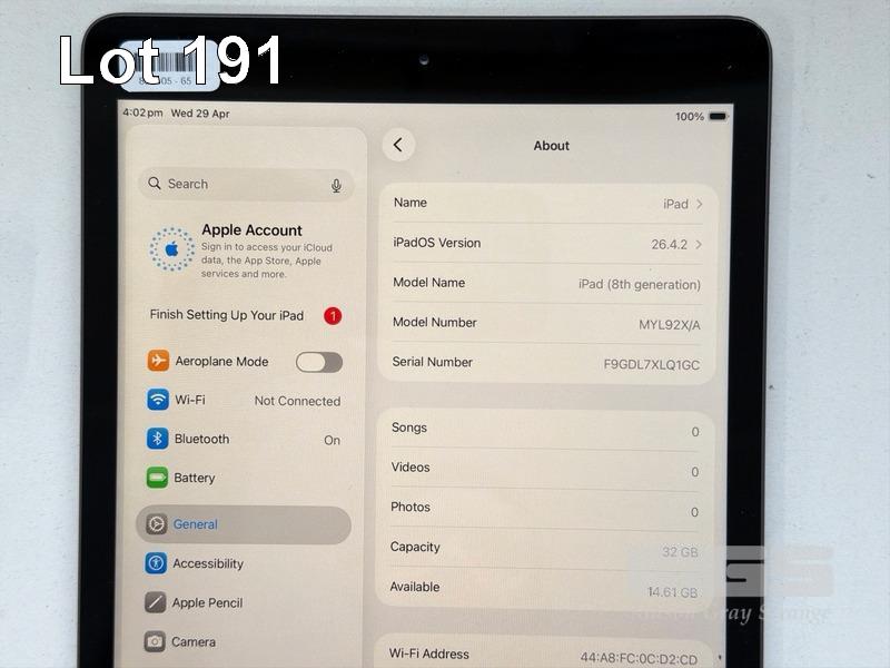 APPLE iPAD 8TH GEN, 32GB, Wi-Fi, SPACE GREY, MODEL MYL92X/A, A2270 WITH CABLE & CHARGER