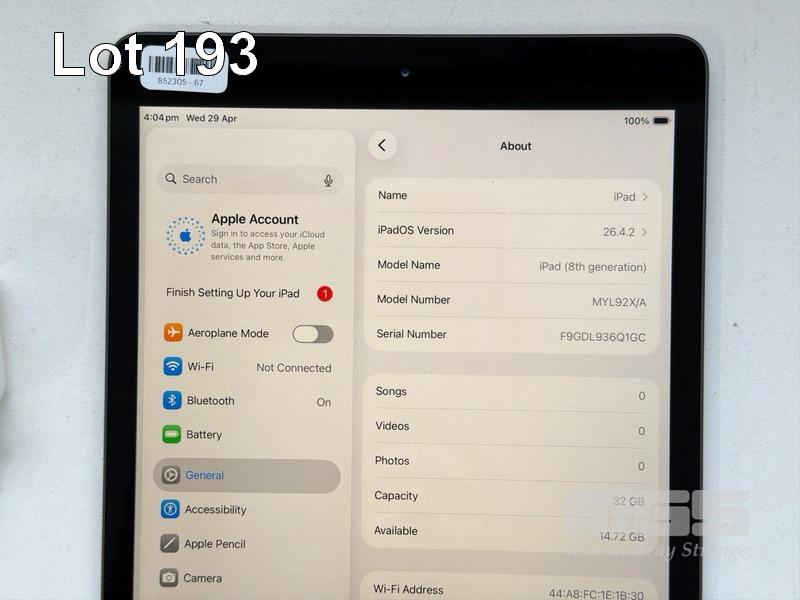APPLE iPAD 8TH GEN, 32GB, Wi-Fi, SPACE GREY, MODEL MYL92X/A, A2270 WITH CABLE & CHARGER
