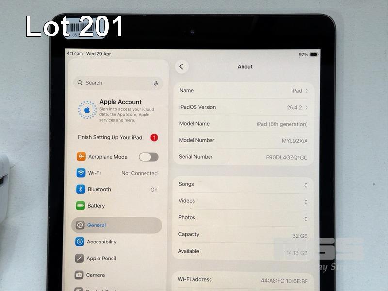 APPLE iPAD 8TH GEN, 32GB, Wi-Fi, SPACE GREY, MODEL MYL92X/A, A2270 WITH CABLE & CHARGER