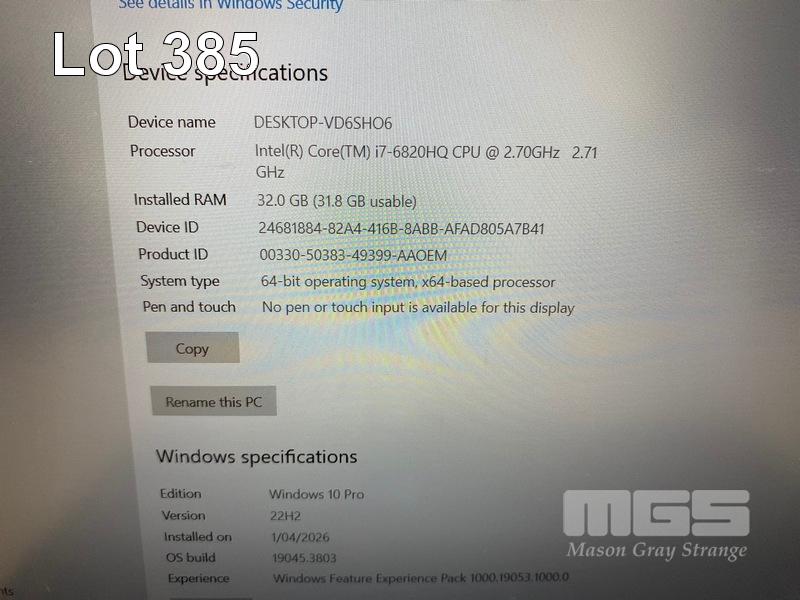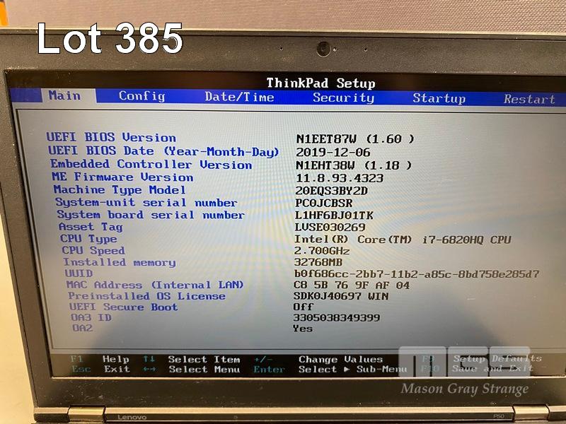 LAPTOP, LENOVO THINKPAD P50 MOBILE WORKSTATION, TYPE 20EQ, CORE i7 6820HQ (6TH GEN) @ 2.7GHz, 32GB DDR4 RAM, 500GB NVMe M.2 SSD, 15.6" WIDESCREEN (1920x1080), 4GB NVIDIA QUADRO M2000M VIDEO, Wi-Fi, BLUETOOTH, WINDOWS 10 PRO INSTALLED (NO POWER SUPPLY) (NOTE: MARKS ON SCREEN, MINOR DAMAGE TO CASING, CASING POOR CONDITION) S/N:PC0JCBSR
