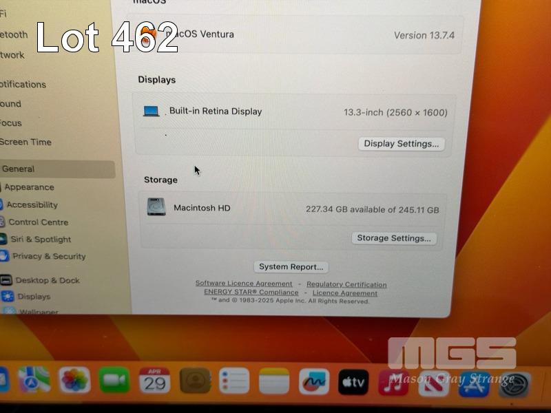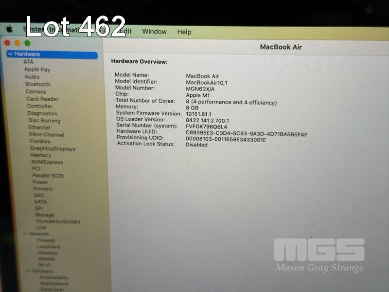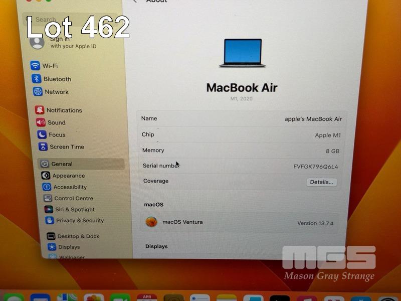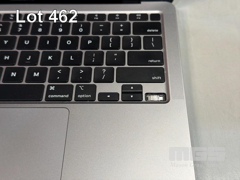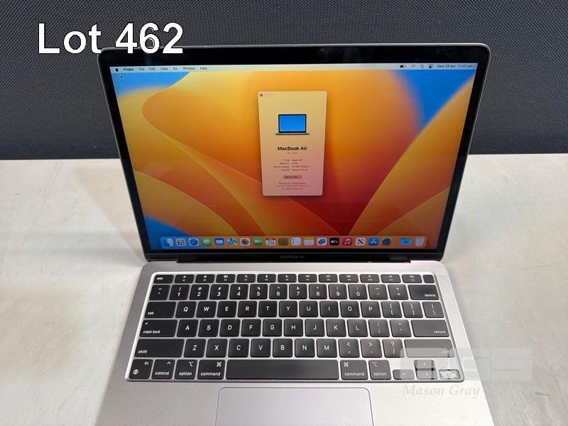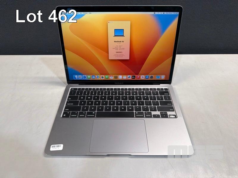 LAPTOP, APPLE MACBOOK AIR (A2337), MGN63X/A, APPLE M1 8 CPU, 7 GPU, 8GB RAM, 256GB SSD, 13.3" RETINA DISPLAY (2560x1600), Wi-Fi, BLUETOOTH, MAC OS 13 INSTALLED (NO USB-C POWER SUPPLY) (NOTE: MISSING 1 x ARROW KEY, MINOR MARKS ON SCREEN) S/N:FVFGK796Q6L4