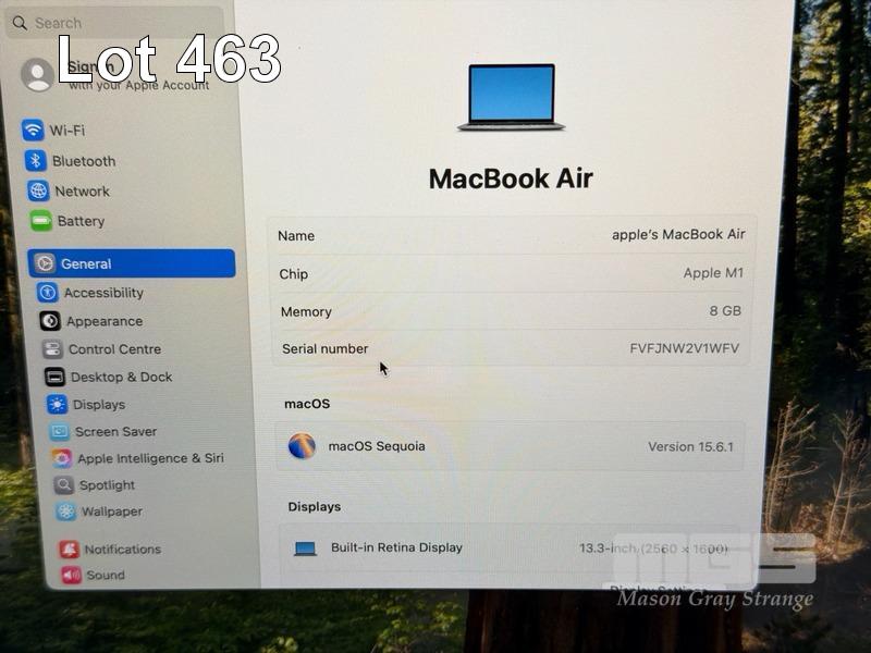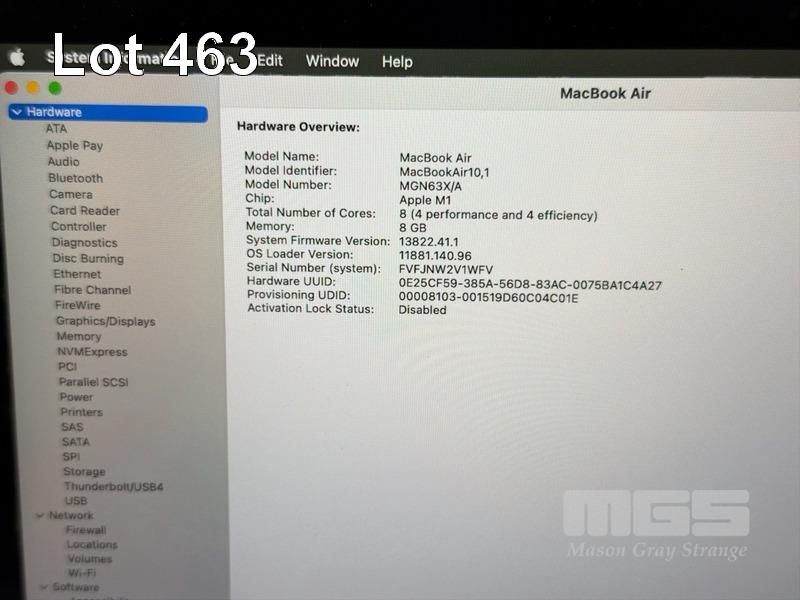 LAPTOP, APPLE MACBOOK AIR (A2337), MGN63X/A, APPLE M1 8 CPU, 7 GPU, 8GB RAM, 256GB SSD, 13.3" RETINA DISPLAY (2560x1600), Wi-Fi, BLUETOOTH, MAC OS 14 INSTALLED (NO USB-C POWER SUPPLY)