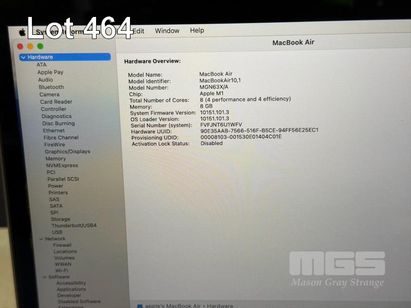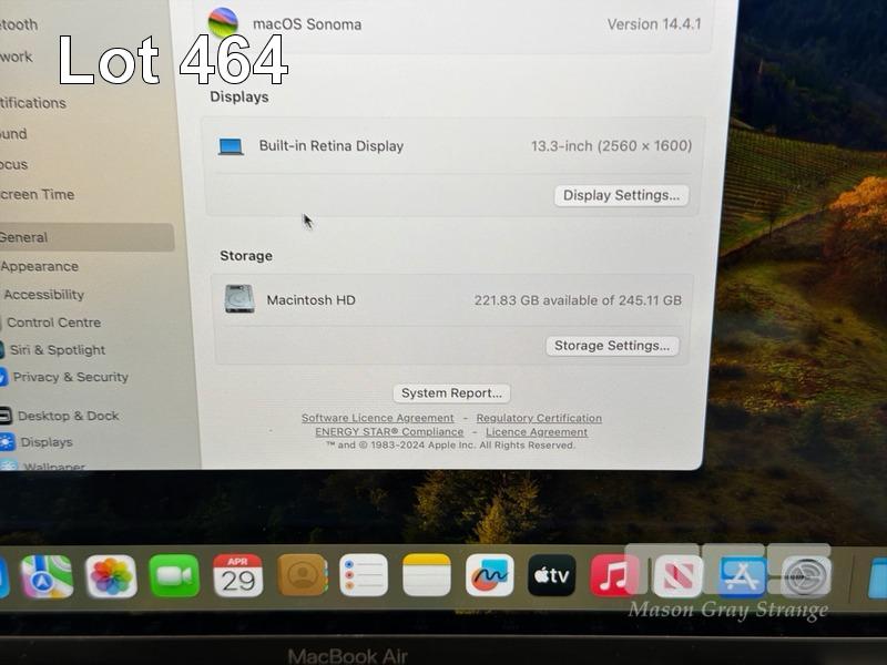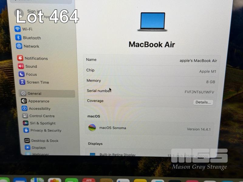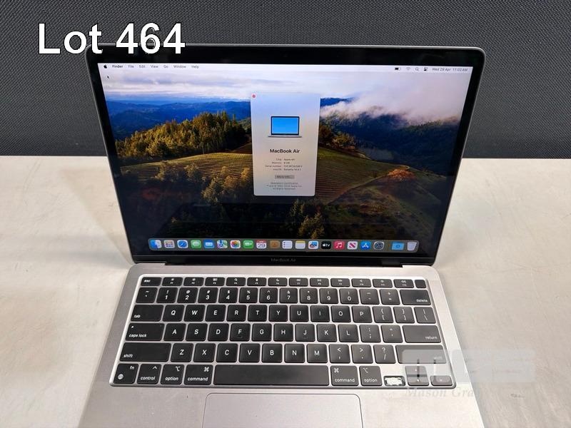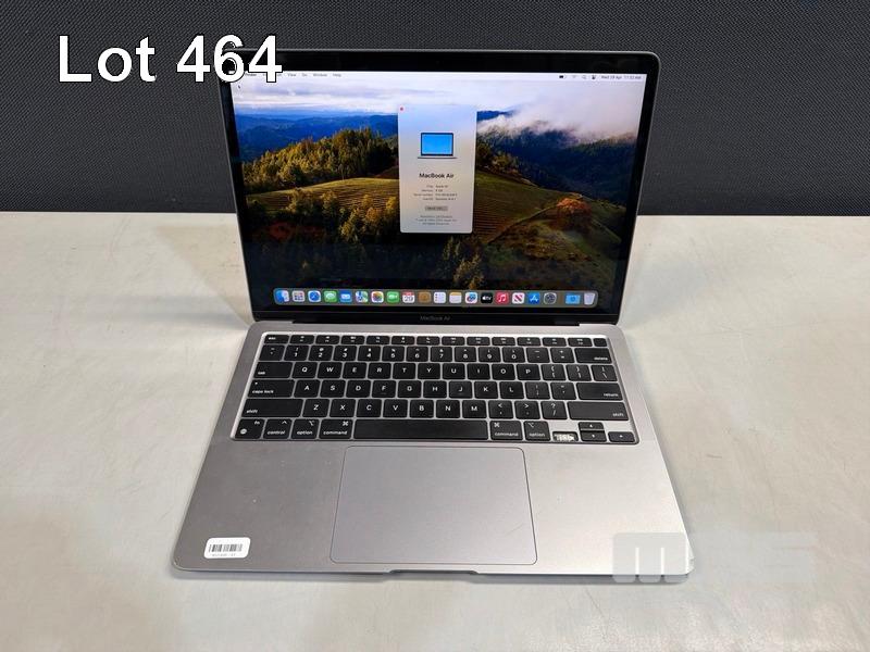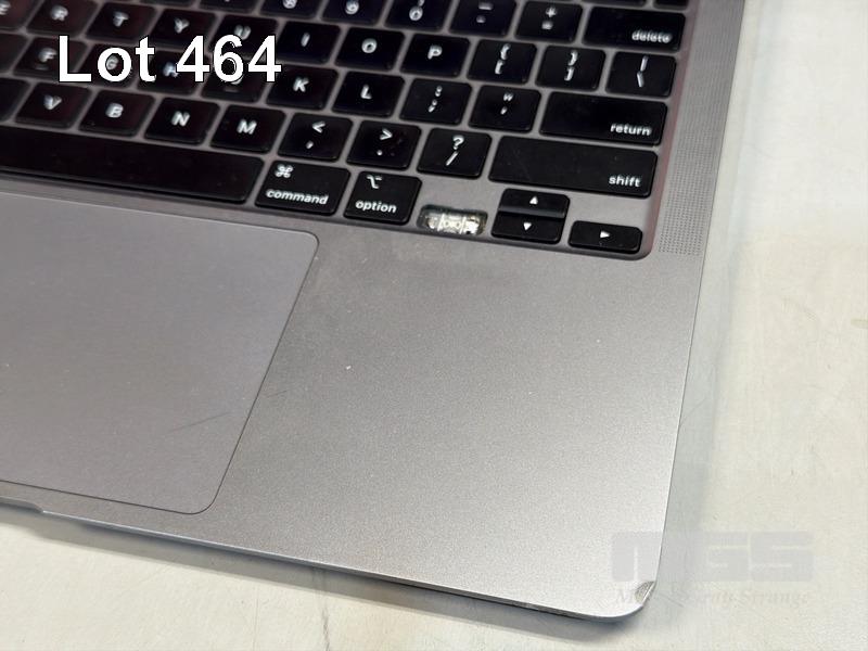 LAPTOP, APPLE MACBOOK AIR (A2337), MGN63X/A, APPLE M1 8 CPU, 7 GPU, 8GB RAM, 256GB SSD, 13.3" RETINA DISPLAY (2560x1600), Wi-Fi, BLUETOOTH, MAC OS 14 INSTALLED (NO USB-C POWER SUPPLY) (NOTE: MISSING 1 x ARROW KEY, MINOR DENT IN CASING, MINOR MARKS ON SCREEN) S/N:FVFJNT6U1WFV