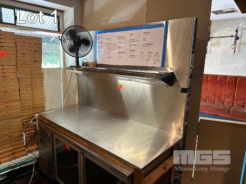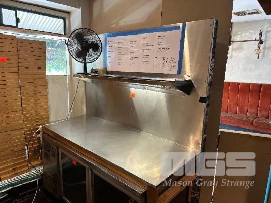STAINLESS STEEL BENCH TOP WITH SPLASH BACK, TIMBER FRAME 1800 x 700mm, SPLASH BACK 1150mm (H) STAINLESS STEEL SHELF, 1600mm (L)