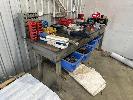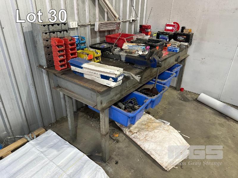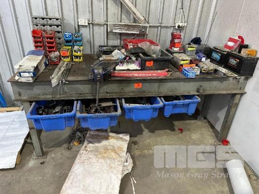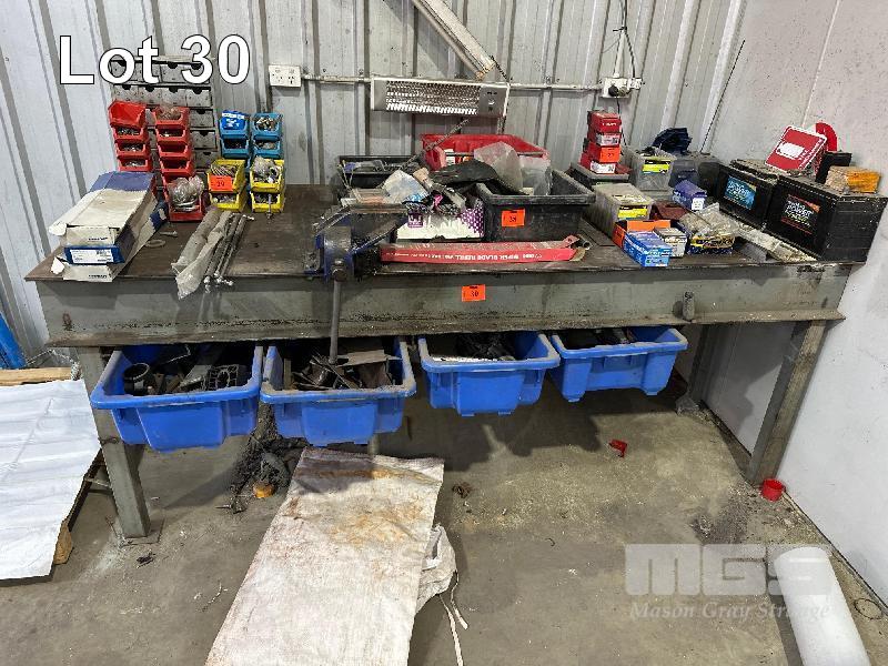 H/D I BEAM STEEL BENCH, 2400 x 1000mm, PLATE TOP, 6mm, WITH SLIDE OUT DRAWER TUBS & CONTENTS & 5" OFFSET VICE