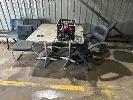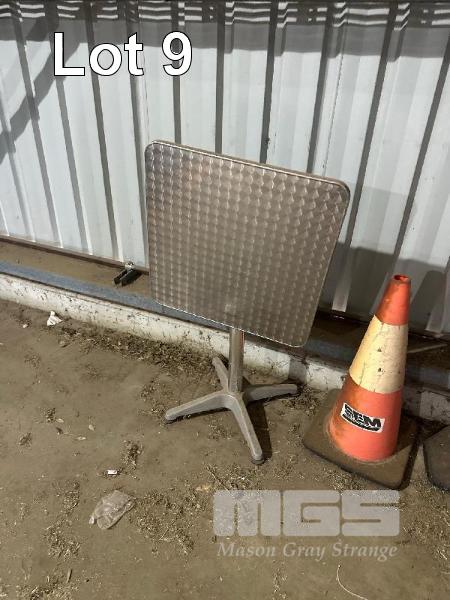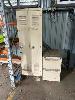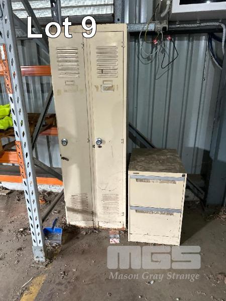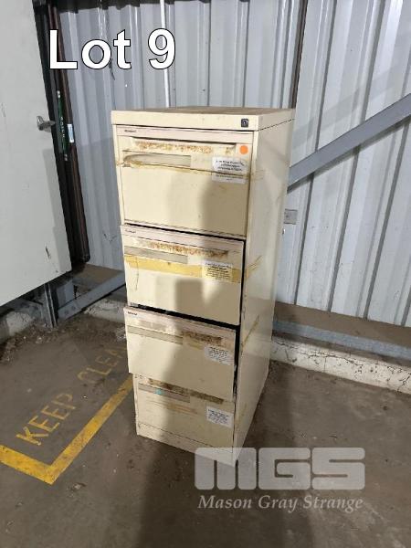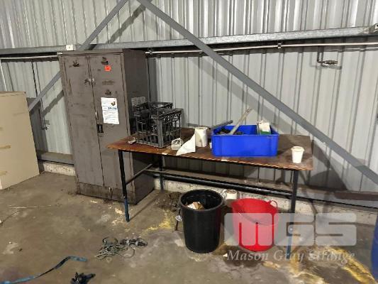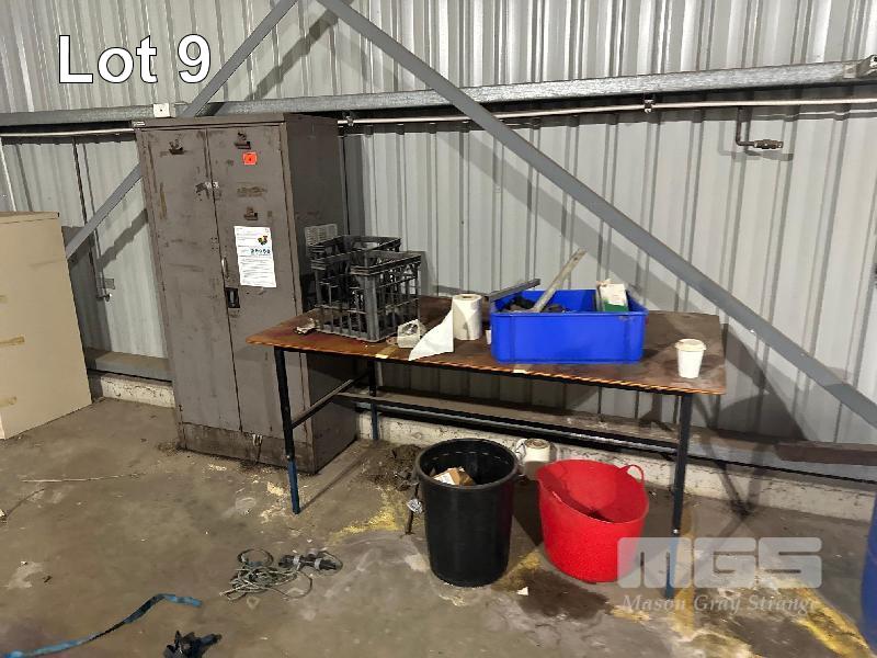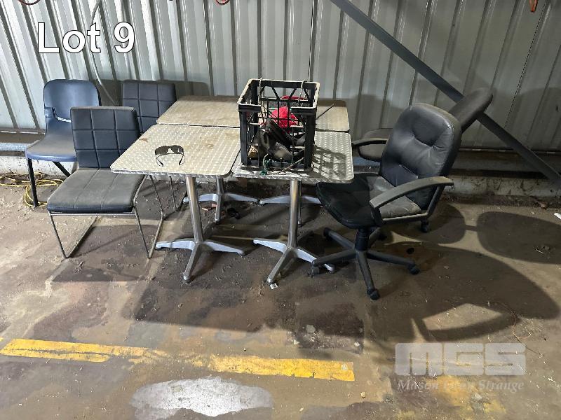 2 x STEEL 4 DRAWER FILING CABINETS, 2 x STEEL SINGLE DOOR LOCKERS, 2 DRAWER FILING CABINET, 2 DOOR STEEL STOCK CUPBOARD, WORK BENCH, 5 x CAFE TABLES, TILTING TOP & ASSORTED CHAIRS