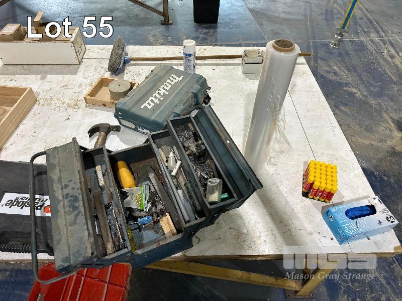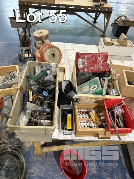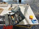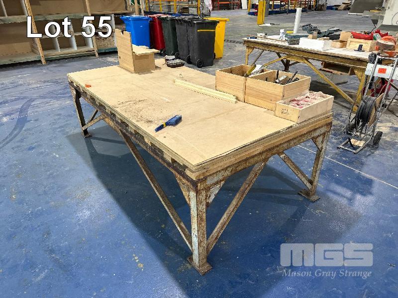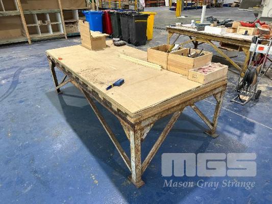 PAIR STEEL FRAME LAYOUT BENCHES, 2400 x 1200mm & CONTENTS TOOLS, NEOPRENE WHEELS