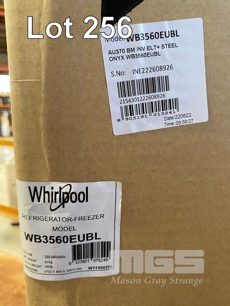FRIDGE, WHIRLPOOL 313L BOTTOM MOUNT - BLACK STAINLESS STEEL, WB3560EUBL (RRP $1,499) (BOXED) (SUBJECT TO INSURANCE CLAIM) S/N:INE222608926