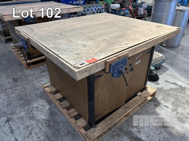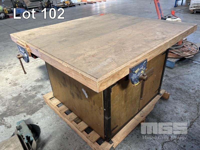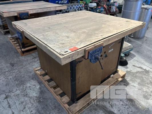 TIMBER WORK BENCH, 1250 x 1400 x 830mm (H), WITH 4 x DAWN VICES, 175mm WITH UNDER BENCH STORAGE