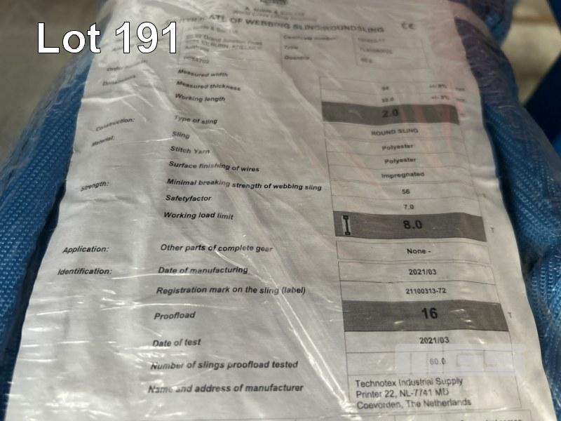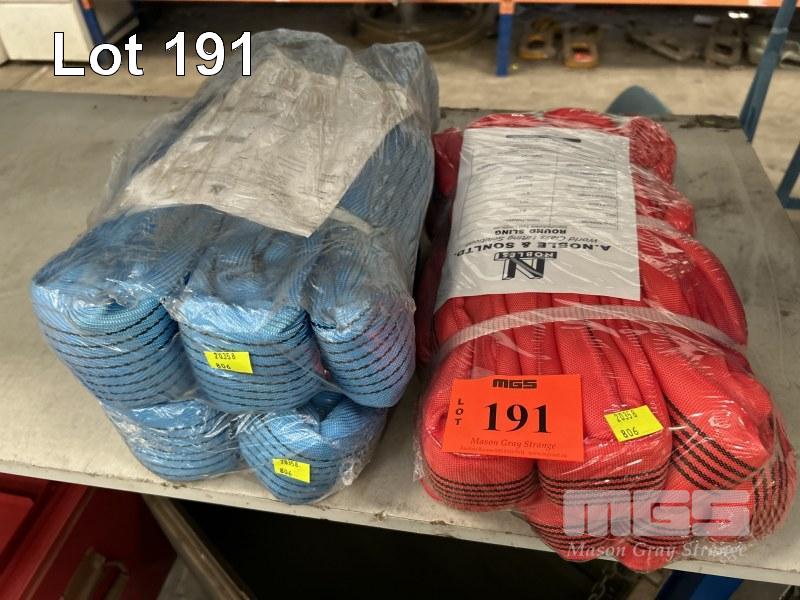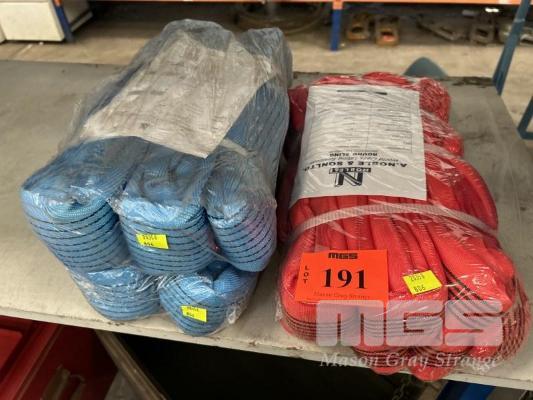 LIFTING SLINGS, NOBLE & SONS 2 @ 8 TONNE x 2m, BLUE & 1 @ 5 TONNE x 5m, RED AS NEW