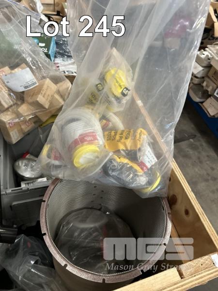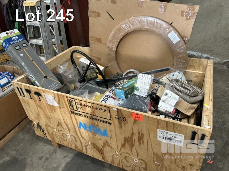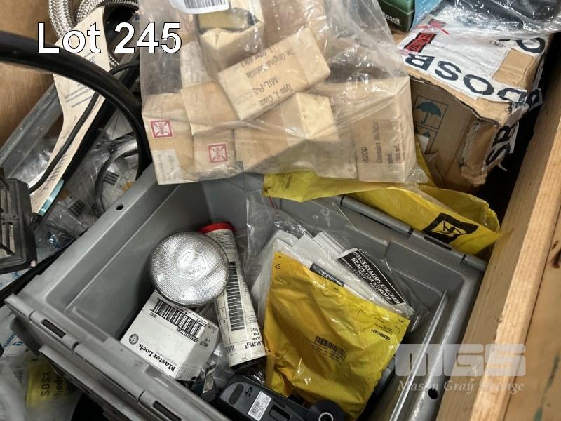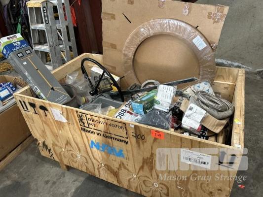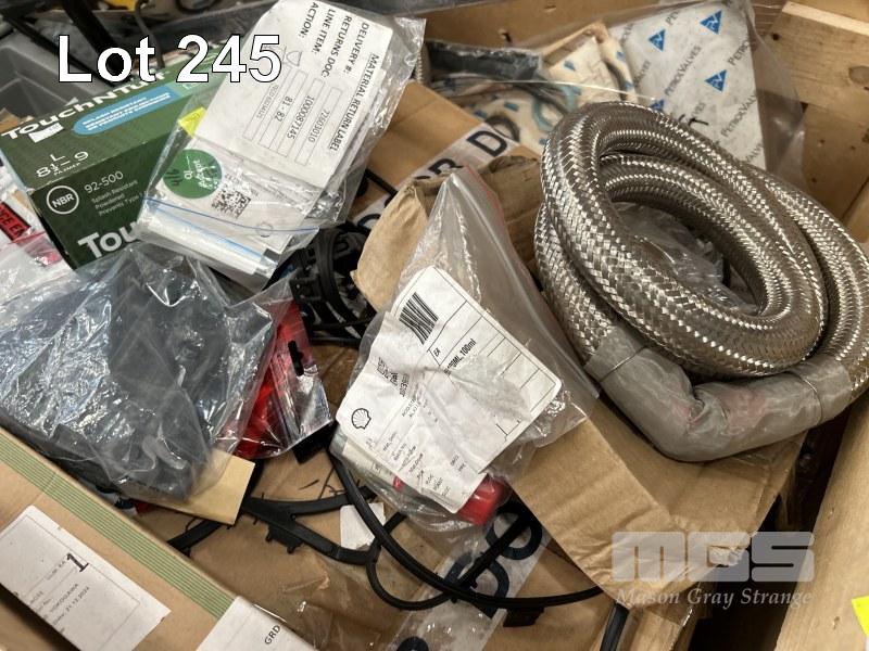 ASSORTED INDUSTRIAL PARTS & COMPONENTS INCLUDING OIL SAMPLE KITS, STAINLESS STEEL BRAIDED HOSE, WORK LIGHTS, VALVE WHEEL, CEALS, ETC CONTENTS TIMBER CRATE