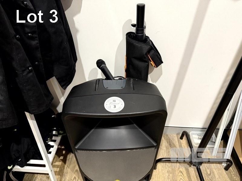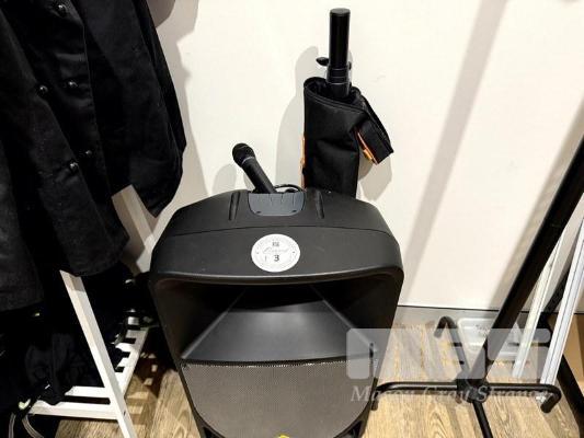 BEHRINGER PORTABLE PA SPEAKER, EUROLIVE B115W WITH STAND IN BAG, & AUDIO TECHNICA WIRELESS MICROPHONE ATW-T220A