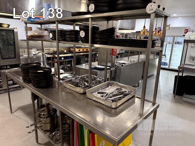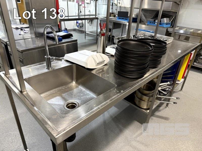 STAINLESS STEEL COMMERCIAL KITCHEN PREPARATION BENCH SECTION, 2550 x 800 x 900/1800mm WITH SINGLE BOWL STAINLESS STEEL SINK, MIXER TAP, UNDERBENCH HALF SHELF, & 2 TIER OVERHEAD SHELVING