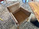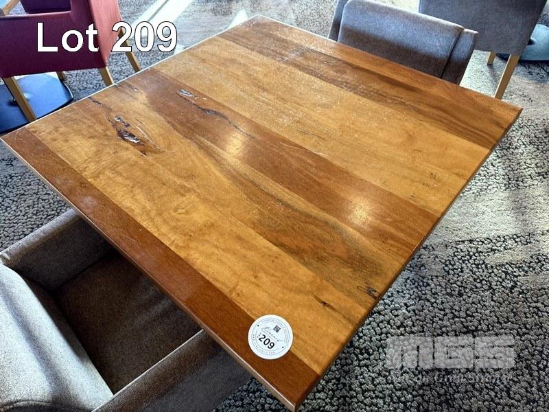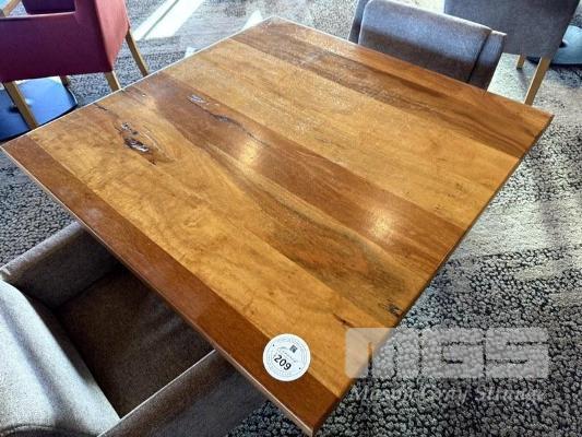 WESTERN AUSTRALIAN MARRI TIMBER TOPPED DINING TABLE 1000 x 1000mm WITH 33mm THICK CLEAR STAIN, STYLUS 5410 BLACK METAL SQUARE BASE & 2 x COMO OTWAY DRIFTWOOD COLOURED FABRIC DINING ARM CHAIRS