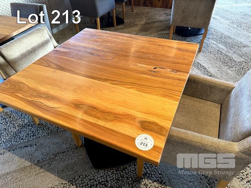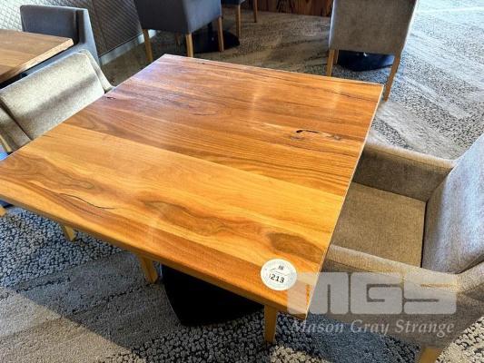 WESTERN AUSTRALIAN MARRI TIMBER TOPPED DINING TABLE 1000 x 1000mm WITH 33mm THICK CLEAR STAIN, STYLUS 5410 BLACK METAL SQUARE BASE & 2 x COMO OTWAY DRIFTWOOD COLOURED FABRIC DINING ARM CHAIRS