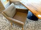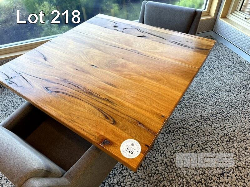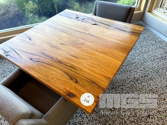 WESTERN AUSTRALIAN MARRI TIMBER TOPPED DINING TABLE 1000 x 1000mm WITH 33mm THICK CLEAR STAIN, STYLUS 5410 BLACK METAL SQUARE BASE & 2 x COMO OTWAY CHARCOAL COLOURED FABRIC DINING ARM CHAIRS