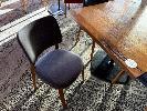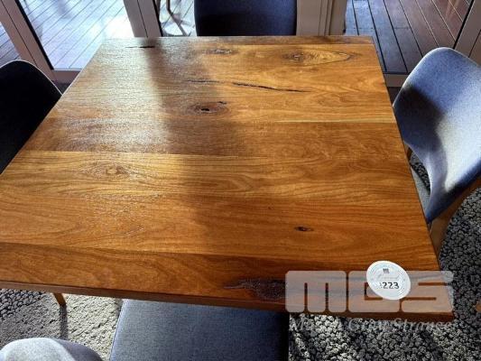 WESTERN AUSTRALIAN MARRI TIMBER TOPPED DINING TABLE 1000 x 1000mm WITH 33mm THICK CLEAR STAIN, STYLUS 5410 BLACK METAL SQUARE BASE & 4 x DIXIE OTWAY CHARCOAL COLOURED FABRIC CAFE STYLE CHAIRS