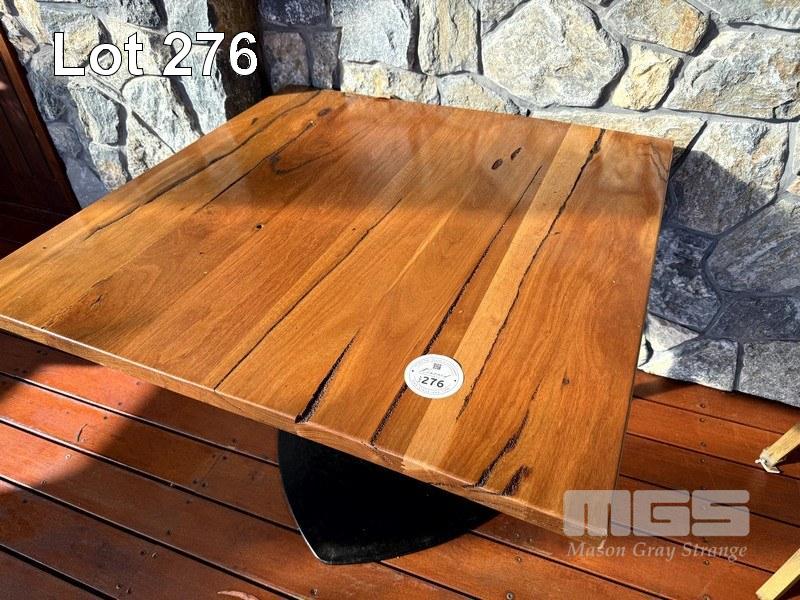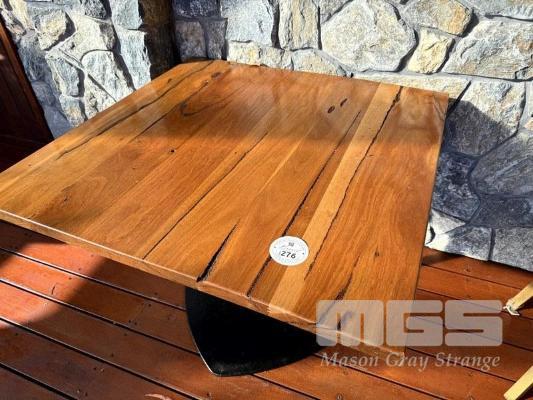 WESTERN AUSTRALIAN MARRI TIMBER TOPPED DINING TABLE 1000 x 1000mm WITH 33mm THICK CLEAR STAIN, STYLUS 5410 BLACK METAL SQUARE BASE