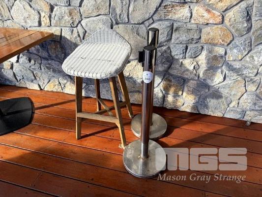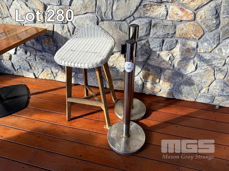 2 x CHROME BOLLARDS & WHITE RATTAN BAR STOOL