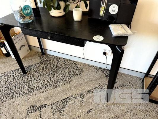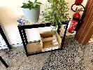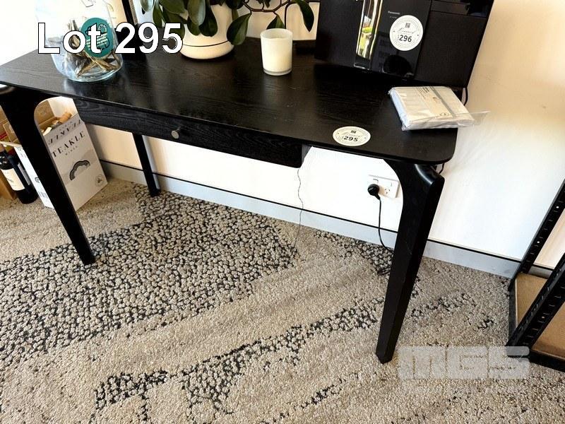 BLACK SINGLE DRAWER HALL TABLE, ROUND BLACK METAL SIDE TABLE, & SMALL SHELVING UNIT