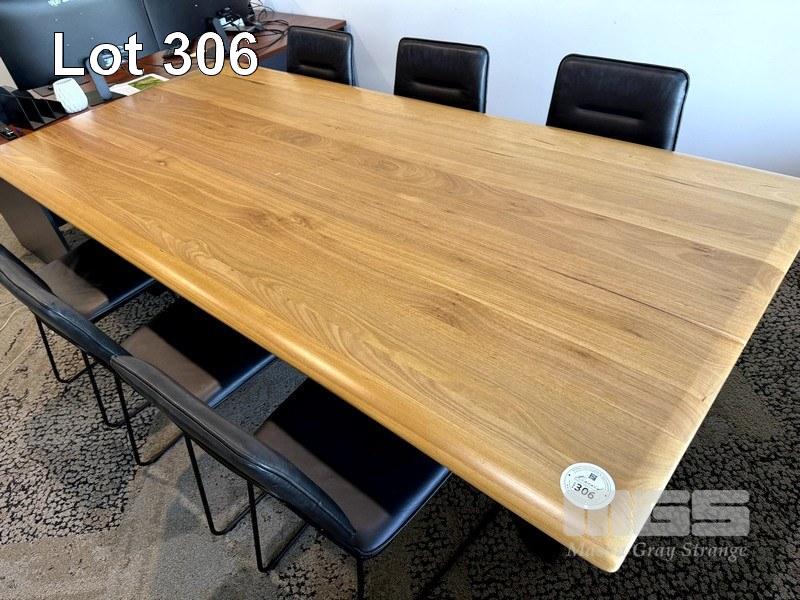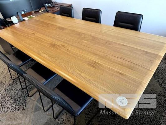 SOLID MAPLE TIMBER TOPPED RECTANGULAR BOARDROOM TABLE 2480 x 1000mm ON BLACK TUBULAR STEEL LEGS, WITH