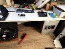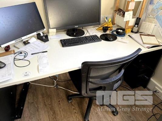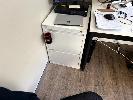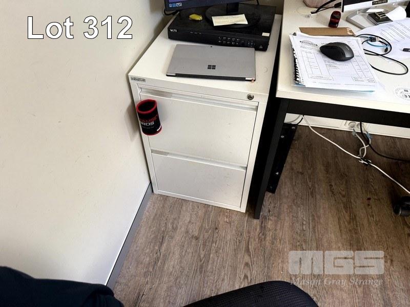 INITIATIVE GREY METAL 2 DRAWER OFFICE FILING CABINET, 2 x WHITE & BLACK LAMINATE OFFICE DESKS, 2 x BLACK FABRIC UPHOLSTERED OFFICE CHAIRS