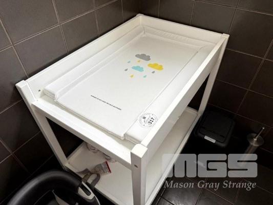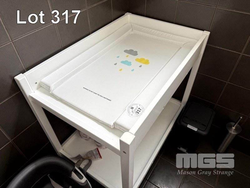 WHITE TIMBER BABY'S CHANGE TABLE & 2 x CHAIR TOP HIGH SEATS