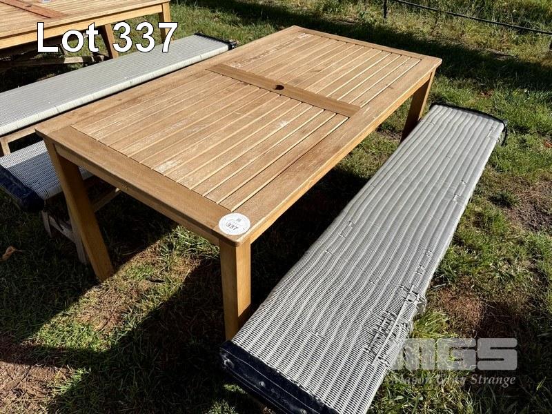 TIMBER RECTANGULAR OUTDOOR TABLE & 2 x RESIN WICKER BENCH SEATS