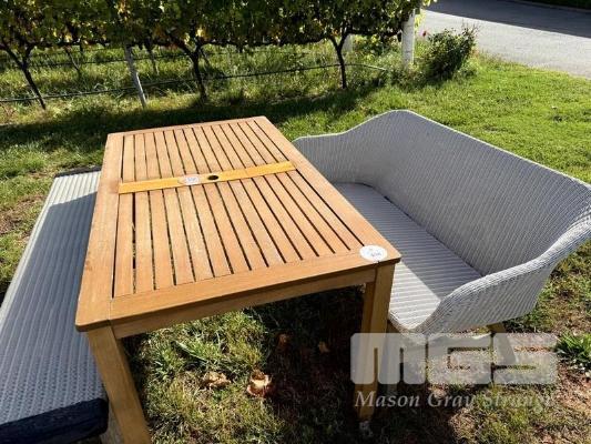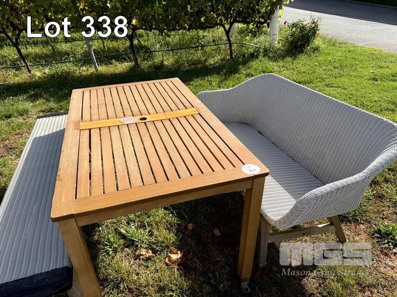 TIMBER RECTANGULAR OUTDOOR TABLE, 1 x RESIN WICKER BENCH SEAT & 1 x RESIN WICKER LOUNGE