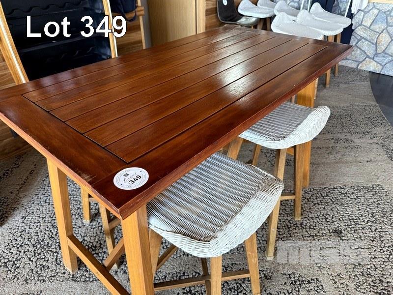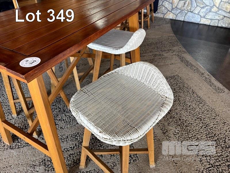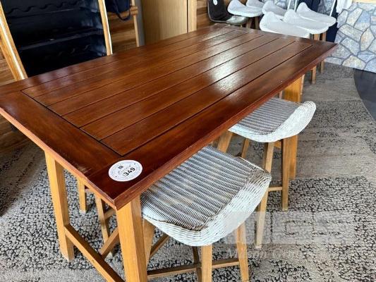 SOLID TIMBER HIGH TABLE 1500 x 800mm WITH 4 x WHITE RATTAN TIMBER FRAMED BAR STOOLS
