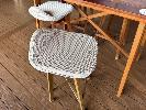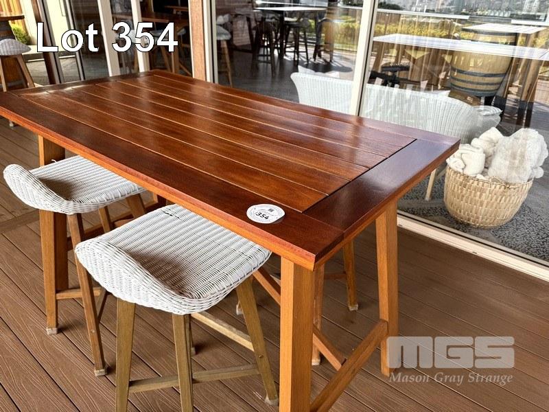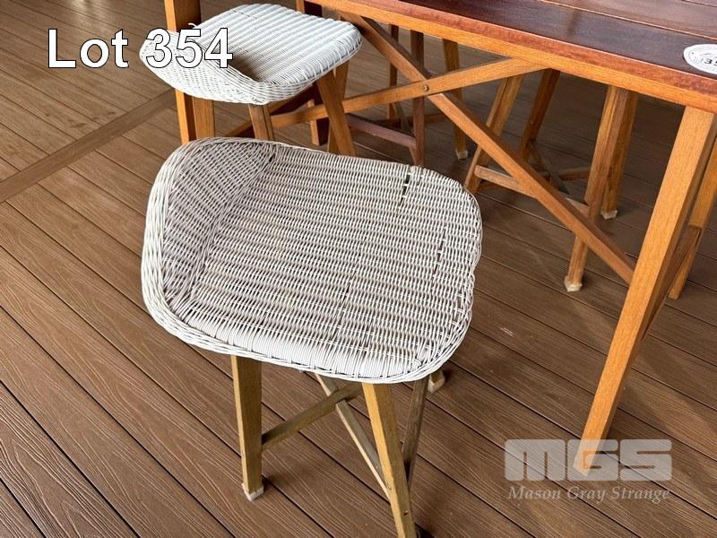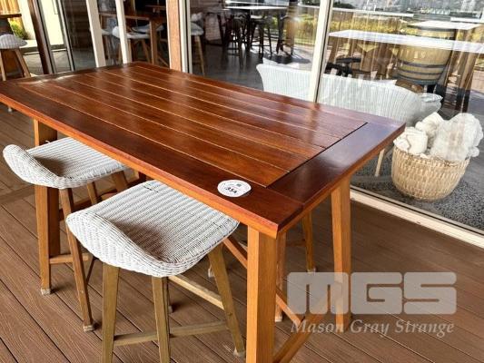 SOLID TIMBER HIGH TABLE 1500 x 800mm WITH 4 x WHITE RATTAN TIMBER FRAMED BAR STOOLS