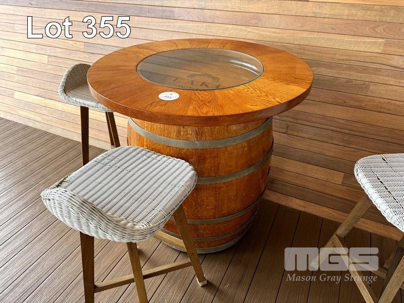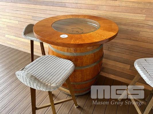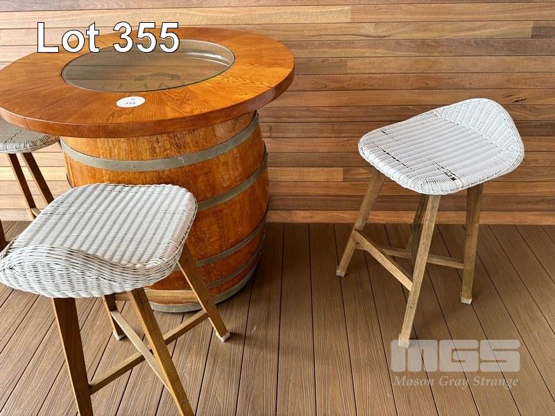 TIMBER WINE BARREL, POLISHED WITH CIRCULAR TIMBER & GLASS TOP WITH 3 z WHITE RATTAN TIMBER FRAMED BAR STOOLS